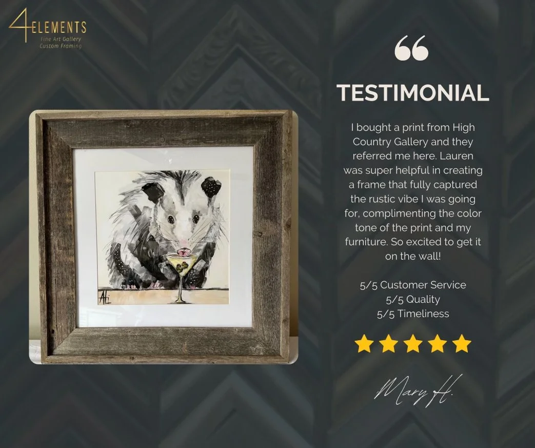At 4 Elements Fine Art & Custom Framing, we believe in putting artists first. We are committed to supporting and celebrating artists’ creativity by showcasing their work with the care and respect it deserves.